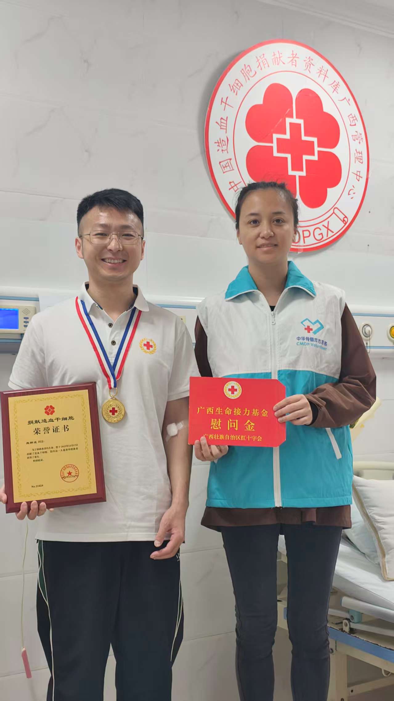 广西管理中心和防城港市红十字会领导亲临现场慰问, 并向熊先生颁发了荣誉证书,对他无私奉献、挽救生命的大爱善举表示了崇高的敬意和衷心的感谢。领导表示:熊先生的义举,生动诠释了‘人道、博爱、奉献’的红十字精神。他不仅是患者的英雄,更是我们全社会的榜样。”