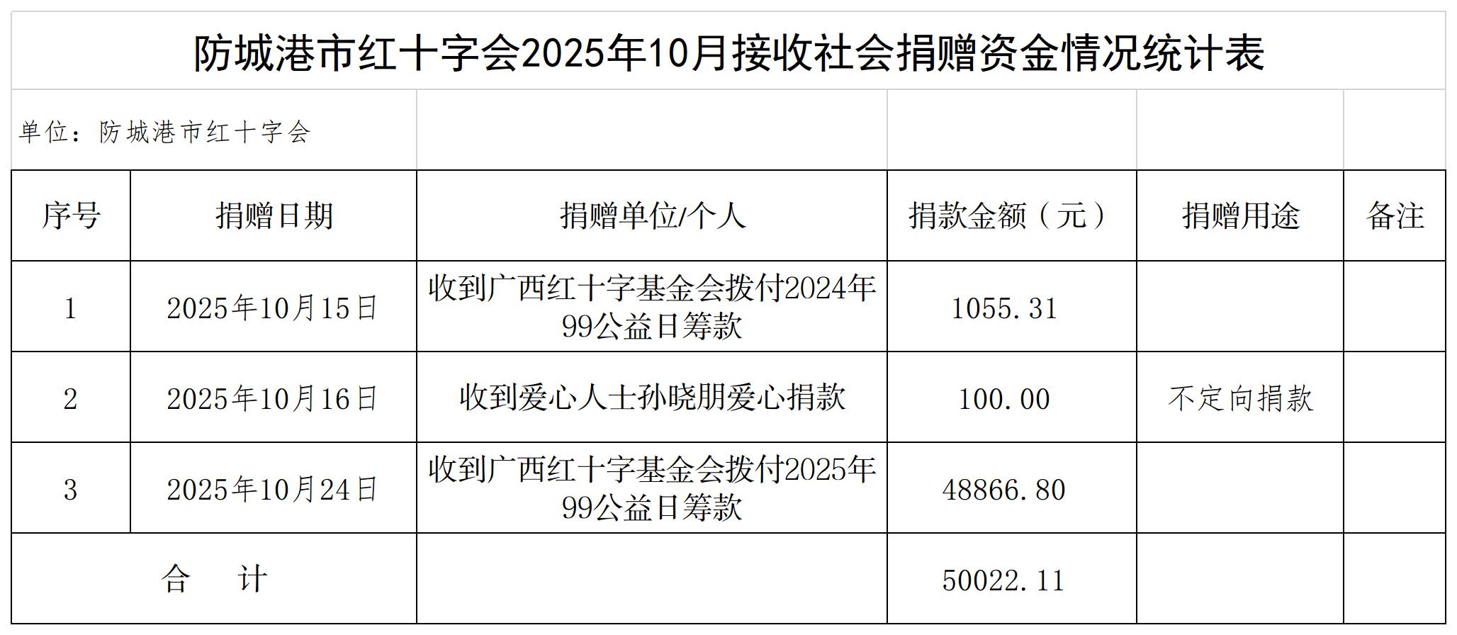2025年10月1日至10月31日,防城港市红十字会累计接收社会捐赠款共3笔,共50022.11元