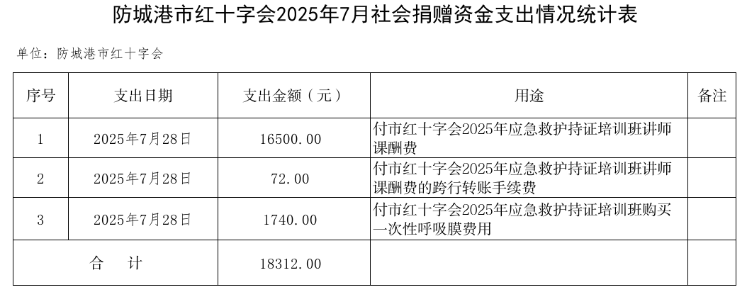 2025年7月1日至7月31日,防城港市红十字会社会捐赠款累计支出共3笔,共18312元。