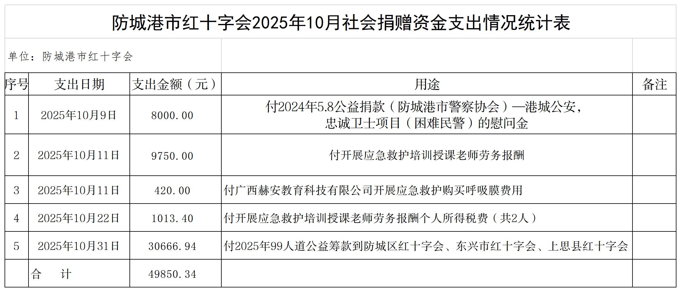 2025年10月1日至10月31日,防城港市红十字会社会捐赠款累计支出共5笔,共49850.34元