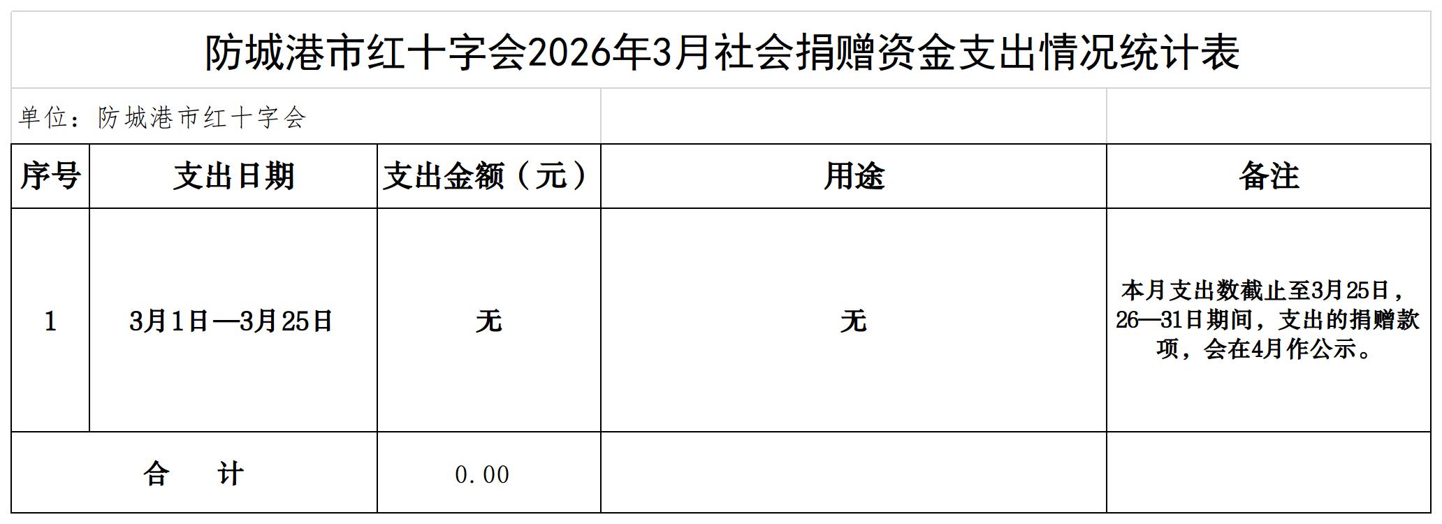 防城港市红十字会2026年3月社会捐赠资金支出情况公示
