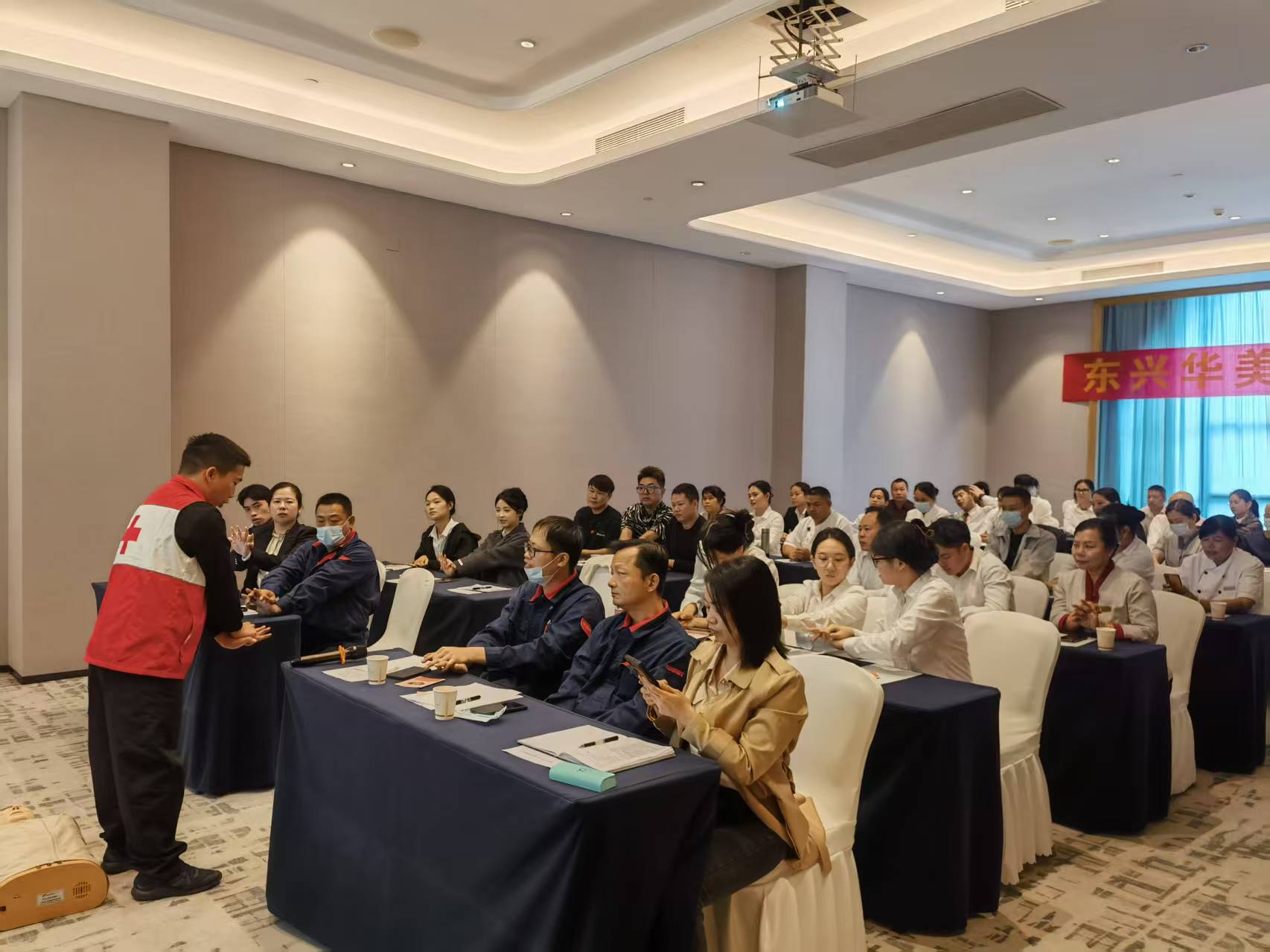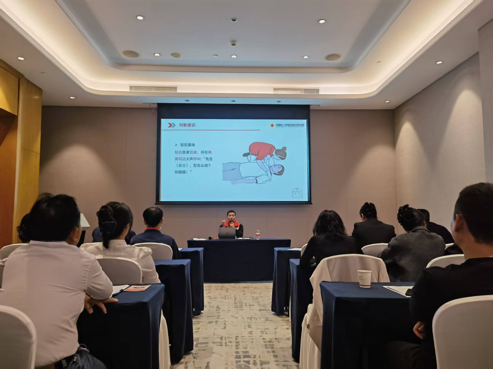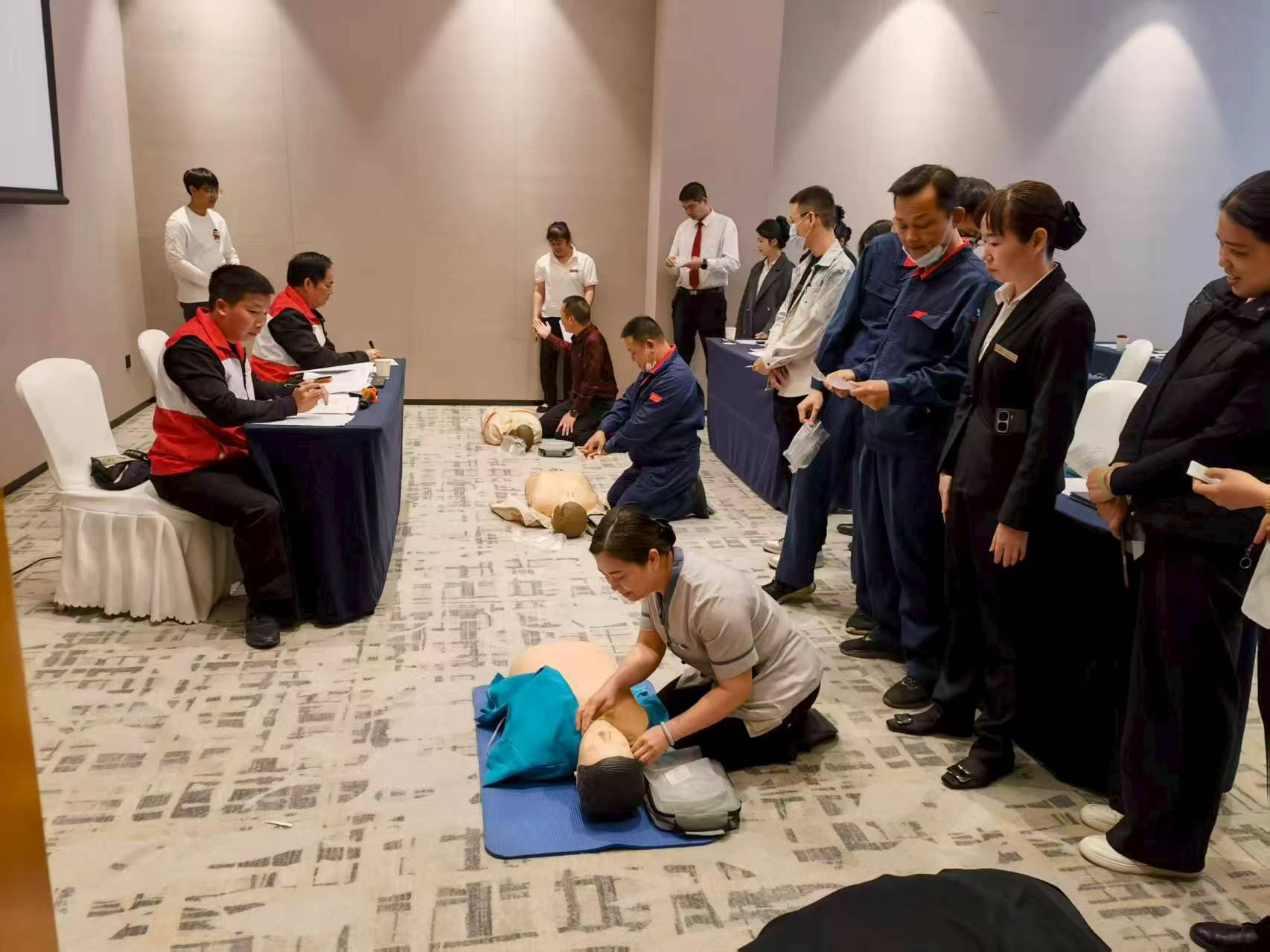 培训现场,红十字会救护师结合日常生活案例,系统讲解心肺复苏急救的目的、原则和注意事项,并详细示范心肺复苏操作流程和自动体外除颤仪(AED)使用方式,细心回答学员的疑问。